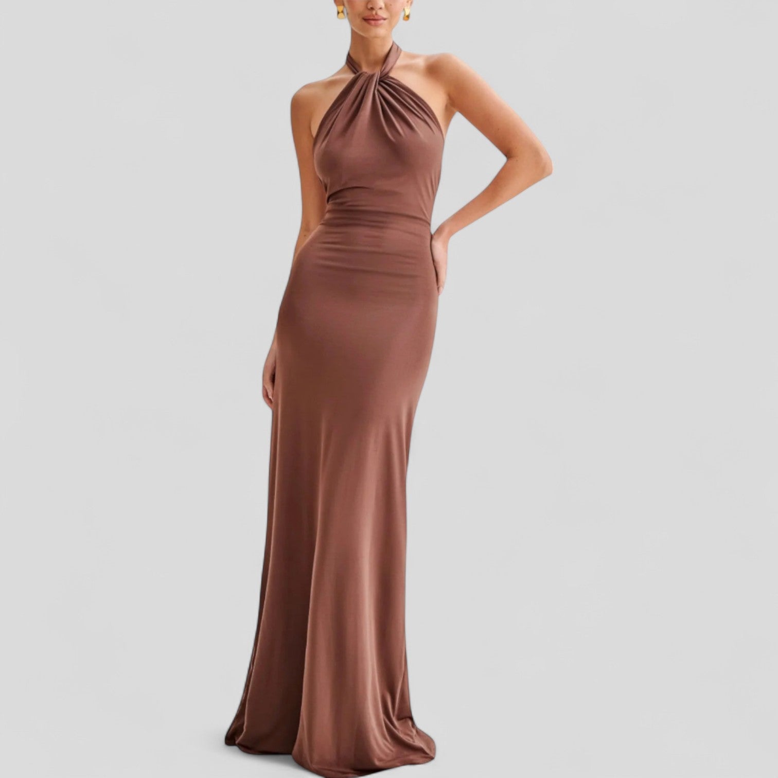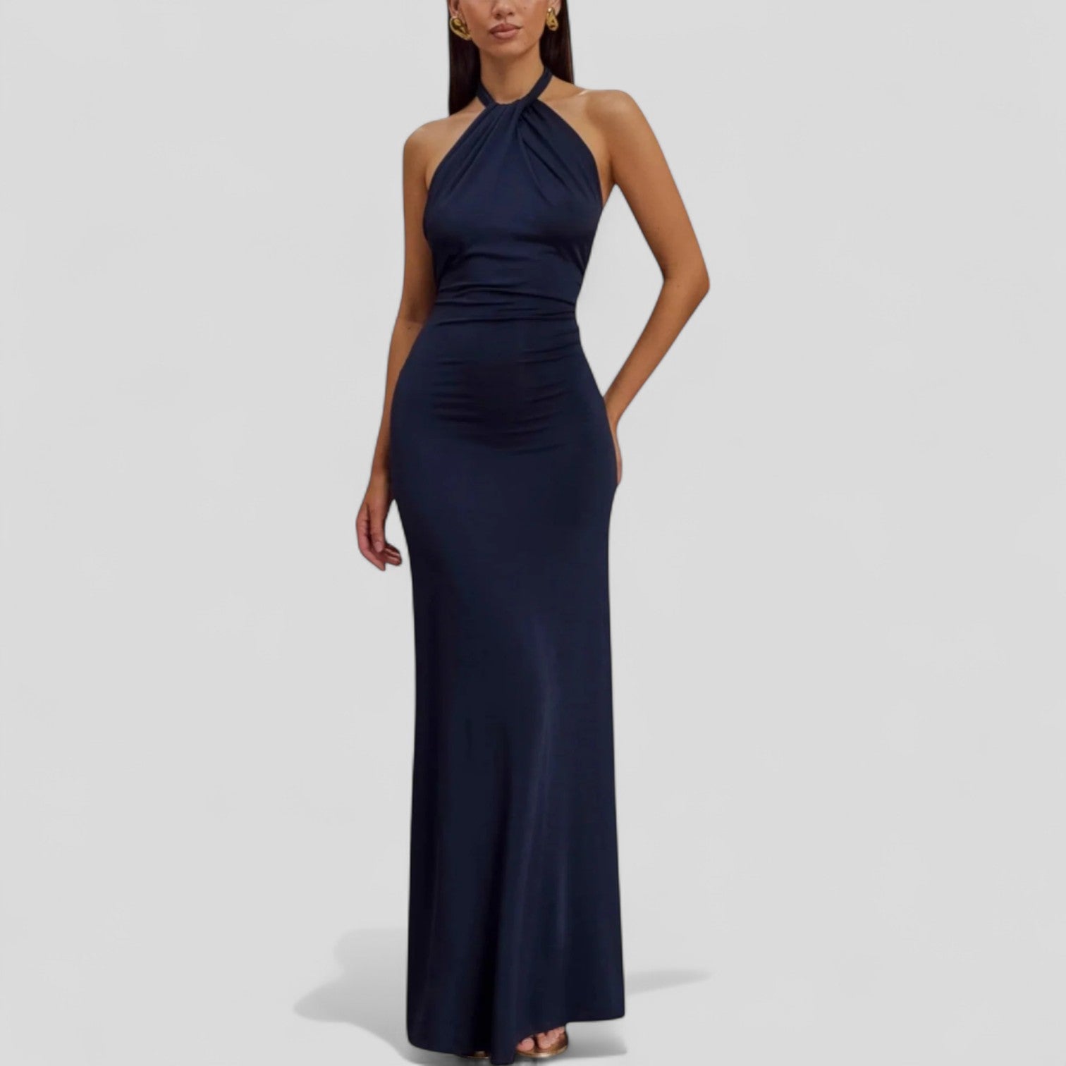 Este vestido destaca por su silueta minimalista. El cuello halter resalta hombros y espalda con un toque de sofisticación.