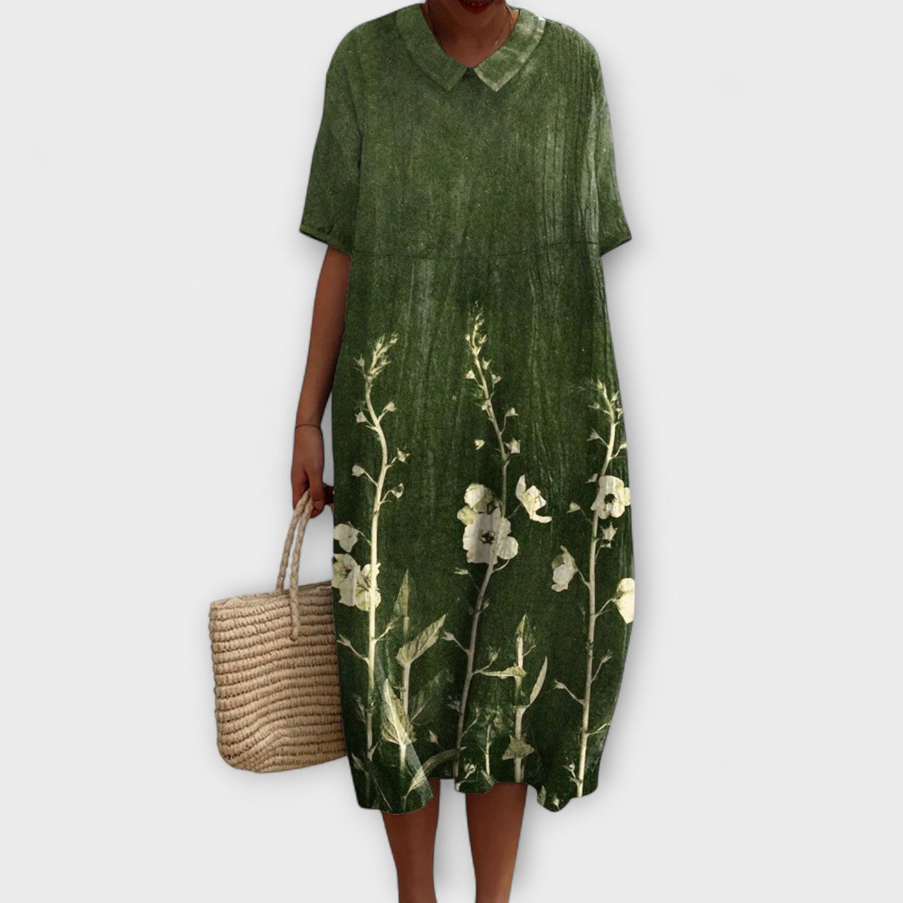 Este vestido ofrece un diseño aireado con mangas de longitud media, adornado con un vibrante estampado floral. Perfecto para paseos veraniegos o días de vacaciones relajados.